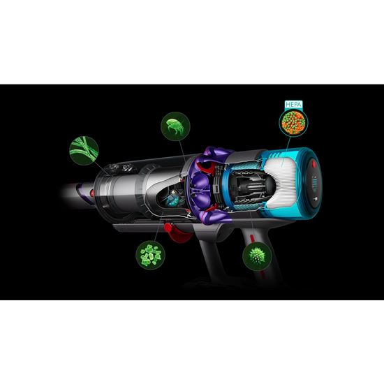 Dosud nevýkonnější motor7 Dyson, který dosahuje až 135 000 otáček za minutu a tak vytváří dosud nejvyšší sací výkon1 u akumulátorového vysavače. - Kompletní utěsnění a filtrace