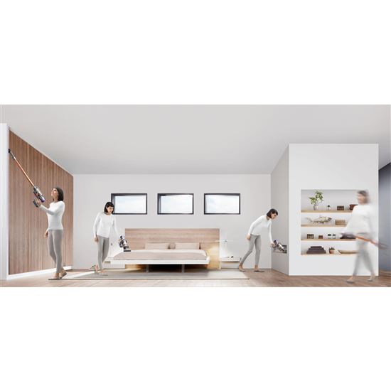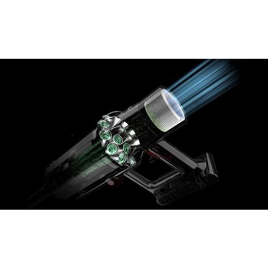 Motor, odpadní nádoba a cyklony jsou uspořádány v jedné přímce, takže vzduch je hnán do cyklon po přímé linii což vytváří o 20% větší sací výkon než u vysavače Dyson V8™.