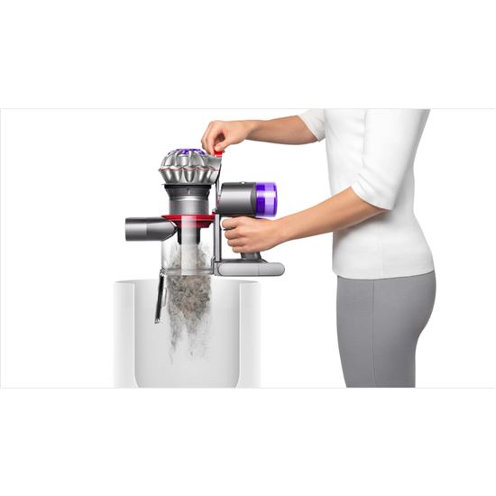Bezdotykové vysypávání sběrné nádoby. Hygienický mechanismus uvolní nečistoty a prach jedním pohybem – nemusíte se jich tedy dotýkat. Úhledné uložení a nabíjení. Váš vysavač Dyson V8™ Advanced je vždy po ruce v nabíjecím úchytu a připraven k použití, když jej potřebujete.