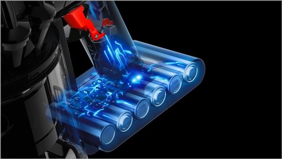 Dyson V8 je napájen Li-Iontovým akumulátorem s nikl-kobalt-hliníkovou elektrodou poskytujícím proud až na 40 minut provozu2 bez toho, aby klesal sací výkon. - Vysoce účinný filtrační systém s utěsněním celého spotřebiče