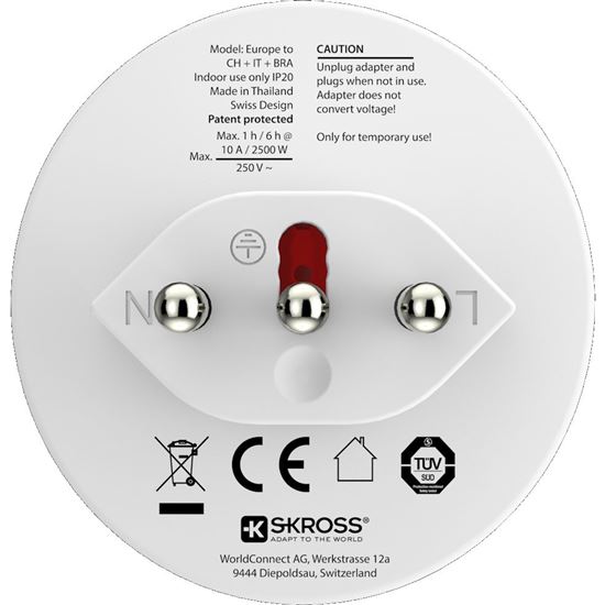Adaptér SKROSS Europe to Switzerland + Italy + Brazil umožňuje bezpečné připojení evropských zařízení v Brazílii, Itálii, Švýcarsku a dalších 12 zemích. Připojí uzemněné i neuzemněné vidlice přívodních kabelů, bez problémů zapojíte vše od notebooků, telefonů až po fény.
