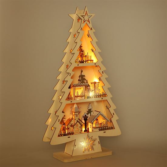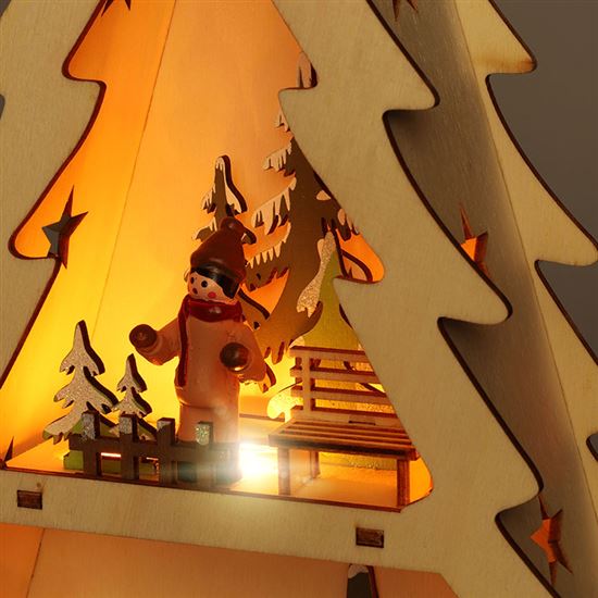 Menší varianta oblíbeného dřevěného stromku je vysoká 53 cm a šířka 30 cm. Je vybavena 13 LED diodami, které září teple bílým světlem a osvěcují drobné barevné dekorace rozmístěné po celé ploše. Barevné prvky v kombinaci s přírodním podkladem působí hravě a vesele, ideální do dětského pokoje nebo jako doplněk k tradiční výzdobě.
