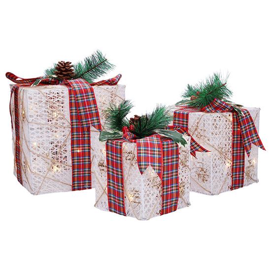 Sada obsahuje tři dárky různých velikostí (20 cm, 15 cm a 12 cm), které jsou osvětleny 48 LED diodami v teplé bílé barvě. Díky praktickému časovači se světla automaticky zapnou na 6 hodin a poté se na 18 hodin vypnou, což zajišťuje pohodlné a energeticky úsporné používání.
