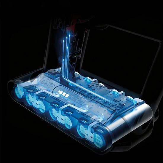 Lithium iontový akumulátor, kterým je Dyson V10™ vybaven, obsahuje o jeden článek víc než akumulátor vysavače Dyson V8™. To umožňuje provoz při vyšším napětí a vytvoření vyššího sacího výkonu. Ale proto, že každá se sedmi vysokokapacitních nikl-kobalt-aluminiových katod je o něco menší, nedochází k navýšení hmotnosti. Vlastní diagnostický systém LED a výškové senzory umožňují vysavačům automaticky optimalizovat výkon podlahové hubice. Takže sací výkon neklesá.