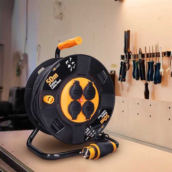 Robustní venkovní prodlužovací přívod na bubnu pro náročné použití Prodlužovací kabel na navíjecím bubnu s délkou 50 metrů a čtyřmi zásuvkami je ideální pro použití venku, na stavbách nebo v dílnách. Gumový kabel zajišťuje odolnost proti povětrnostním podmínkám a mechanickému namáhání. Produkt je navržen pro bezpečné a spolehlivé připojení stavebních, zahradních i méně náročných průmyslových zařízení.