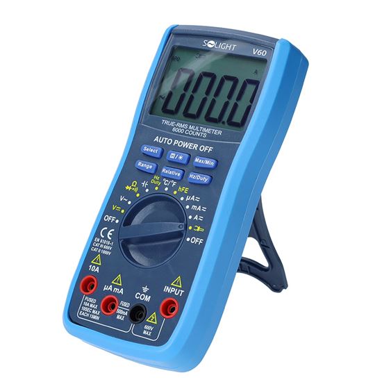 Digitální multimetr s podsvíceným LCD displejem (64 × 42 mm) a maximálním zobrazením 6000 hodnot. Nabízí funkci HOLD pro zachování hodnoty, relativní měření (REL Mode) a funkci MAX/MIN pro záznam extrémních hodnot. Test diod, tranzistorů hFE, test spojitosti s bzučákem. Automatická detekce polarity, indikace nebezpečného napětí. Měří DC/AC napětí (600mV – 1000V), DC/AC proud (600µA – 10A), odpor (600Ω – 60MΩ), kapacitu (60nF – 60mF), teplotu (-40°C – 1000°C), frekvenci (10Hz – 10MHz). Ochrana proti přetížení a vysokému napětí (1000V DC / 750V AC). Napájení: 9V baterie (6F22). Rozměry: 190 × 90 × 35 mm, hmotnost: 357 g.