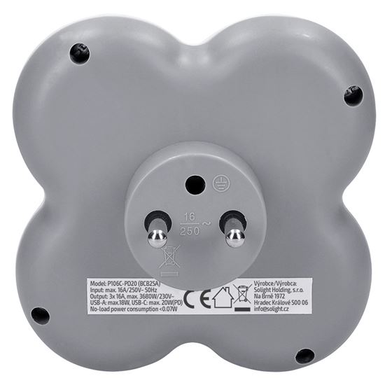 Solight rozbočka, 3x 16A, USB A+C rychlonabíječka 20W PD, bílá-šedá | SOLIGHT